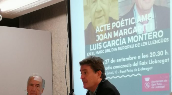 Èxit. Ple de gom a gom. La sala d’actes del Centre Cívic Mas Lluí de Sant Feliu de Llobregat va quedar petita per acollir el recital de poesia de Joan Margarit i Luis Garcia Montero.
