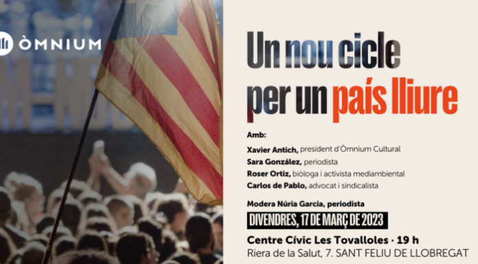 Òmnium Baix Llobregat Est organitza aquest divendres, 17 de març, a les 7 de la tarda, l’acte “Un nou cicle per un país lliure” al Centre Cívic Les Tovalloles, a la Riera de la Salut, 7, de Sant Feliu...